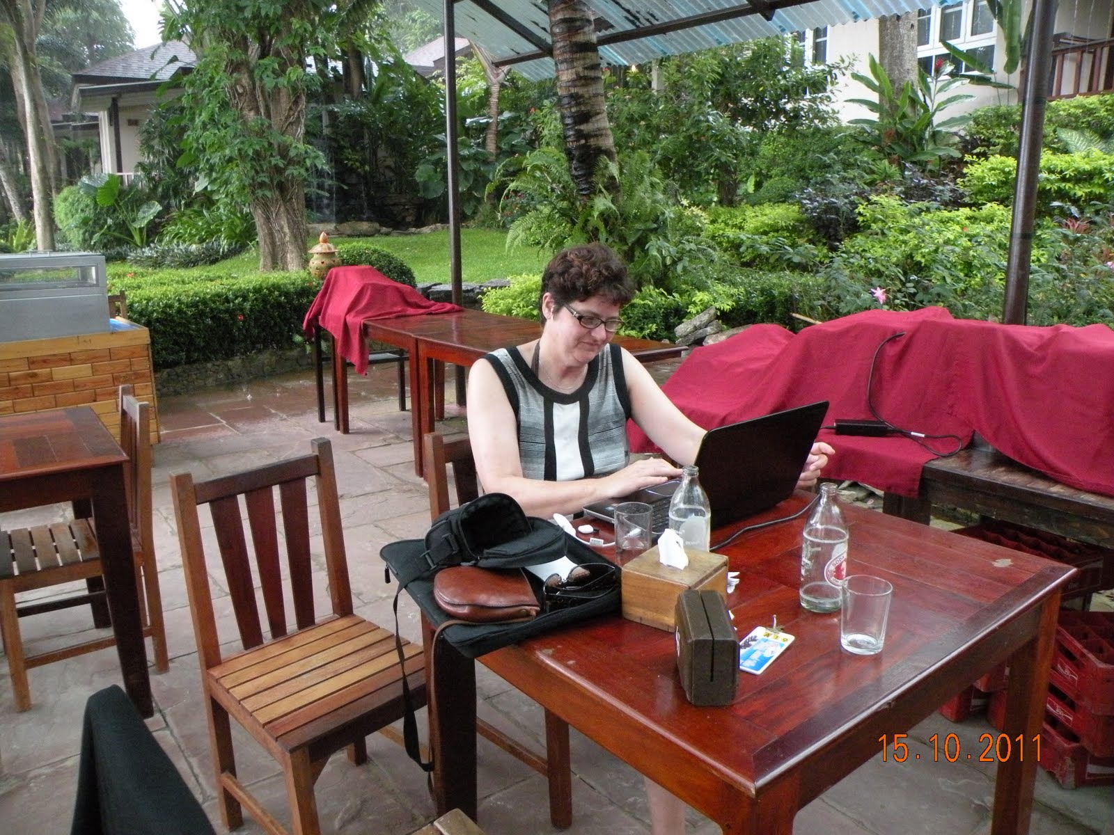Billed: "Kontortid" - fast plads i restauranten (på stranden) pga. internetforbindelsen var meget dårlig på Koh Samed....SKRIG!!! hvor var det træls at uploade billeder...men næsten endnu værre, at få informationer om "The Flod" og "hvad nu" mht. vores praktik. Allerede da vi blev flyttet fra Bangkok, troede ingen af os på, at vi ville komme tilbage til Ayutthaya.
